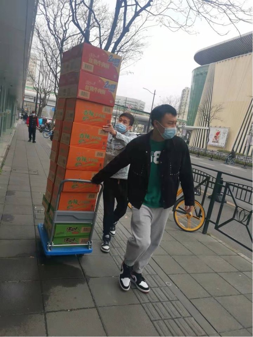 三天前,小张接到一个电话,10多公里外的一个公寓,有200多人住着,生活物资短缺。他没犹豫,挂了电话就开始联系货源,我们只是一个便利店,存货也不足,打了好几家门店电话,还联系了供货商,给他们搞来几十箱泡面、面包什么的,找了货车帮他们送过去了。