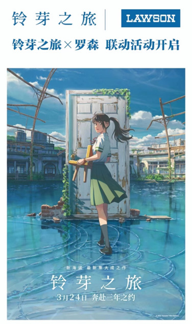 3月22日起,罗森陆续在沈阳、大连、武汉、成都、重庆、合肥、芜湖、厦门等地开启《铃芽之旅》×罗森限时联动主题店,并在线上线下售卖明信片、帆布袋、精美徽章等限定周边商品。